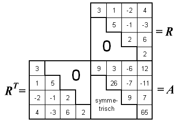 In Zeile 27 wird B nach Cholesky zerlegt, die entstehende Rechtsdreiecksmatrix wird invertiert. Mit dem Ergebnis wird in Zeile 28 die mit As (A-Stern) bezeichnete Matrix