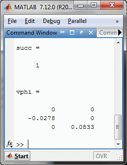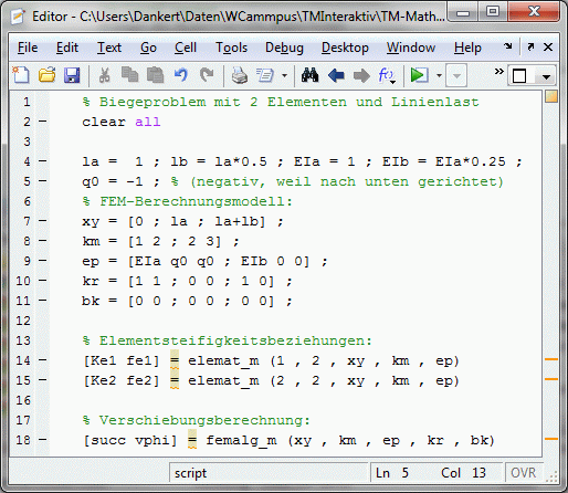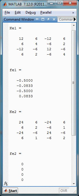 Weil die Zeilen 14, 15 und 18 nicht mit einem Semikolon abgeschlossen wurden, werden die berechneten Ergebnisse in das Command Window ausgegeben Element-Steifigkeitsmatrix Ke1, Vektor der reduzierten Elementlasten fe1, Element-Steifigkeitsmatrix Ke2, Vektor der reduzierten Elementlasten fe2, Indikator succ für Erfolg (1) bzw. Misserfolg (0) der Verformungsberechnung und die Matrix der Knotenverformungen vphi (3 Zeilen für 3 Knoten, jeweils Verschiebung v und Biegewinkel φ). Nachfolgend sieht man die Command-Window-Ausgabe: