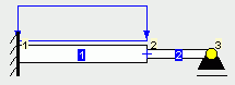 Für die nebenstehend zu sehende Nummerierung des Systems mit zwei Elementen und drei Knoten wird das Berechnungsmodell für Matlab-Femset definiert. Dabei werden für EIa , la und q0 Einheitswerte verwendet, weil so die Zugehörigkeit der Ergebnisse zu den oben angegebenen allgemeinen Formeln deutlich wird:
