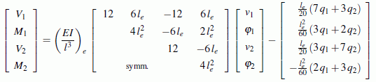 Die Element-Knotenlasten (jeweils eine Kraft und ein Moment, nebenstehendes Bild) werden mit den gleichen Richtungen wie die Knotenverformungen (Vertikalverschiebung bzw. Biegewinkel) positiv definiert.