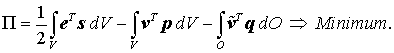 Darin ist e der Vektor der Verzerrungen (Dehnungen und Gleitungen), s der Vektor der Spannungen (Normal- und Schubspannungen), v ist der Vektor der Verschiebungen, p der Vektor der volumenbezogenen Belastung (z. B.: Eigengewicht, Fliehkraft), q der Vektor der Oberflächenlasten (z. B.: Druck).