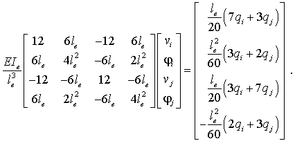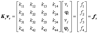 mit der so genannten Systemsteifigkeitsmatrix K und dem Systembelastungsvektor f (eventuell an den Knoten angreifende äußere diskrete Lasten dürfen auf die entsprechenden Positionen in f einfach aufaddiert werden).
