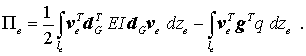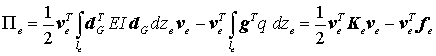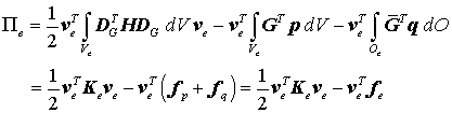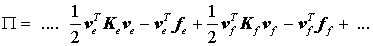 Zur Erinnerung: Dies ist (nach einer etwas aufwändigen Zwischenrechnung) das Gesamtpotential, aufgeschrieben mit Ritzschen Ansatzfunktionen. Diese sind über die Integralausdrücke in die Elementsteifigkeitsmatrizen und die Elementbelastungsvektoren eingeflossen, während die Ritzschen Ansatzparamter als Knotenverschiebungen (z. B. in ve und vf) in separaten Vektoren konzentriert sind.