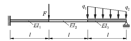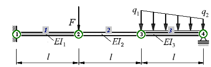 l = 1 m ; F = 1 kN ; q1 = 2 kN/m ; q2 = 1 kN/m ; EI1 = EI3 = 1 kNm2 ; EI2 = 2 kNm2 .