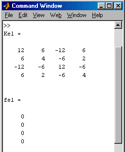 Nebenstehend sieht man nur den ersten Teil (Ausgabe des Ergebnisses der Berechnung in Zeile 12) des Command Windows (Elementsteifigkeitsbeziehung des Elements 1). Alle übrigen Ausgaben sind im nachfolgenden Bild so zusammengestellt worden, dass man die Zusammenhänge zwischen Elementsteifigkeitsbeziehungen und Systemsteifigkeitsbeziehung erkennen kann.
