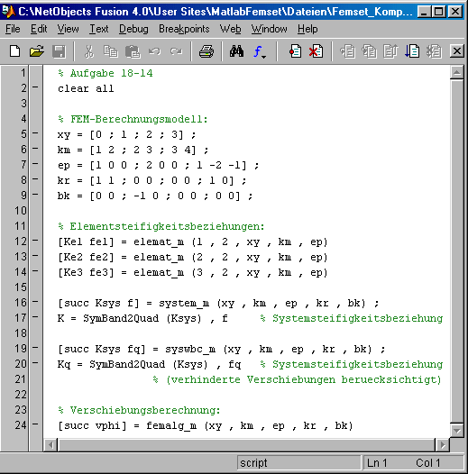 Das Matlab-Interface zum Finite-Elemente-Baukasten Femset gestattet Einblicke in die Zwischenstufen des Algorithmus. Deshalb wird mit dem nebenstehend zu sehenden Matlab-Script zunächst in den Zeilen 5 bis 9 das Berechnungsmodell definiert, danach werden die drei Elementsteifigkeitsbeziehungenen (Zeilen 12 bis 14), die Systemsteifigkeitsbeziehung ohne (Zeile 16) bzw. mit Berücksichtigung der Randbedingungen (Zeile 19) berechnet und in das Command Window ausgegeben. Abschließend werden die Verschiebungen berechnet (Zeile 24).