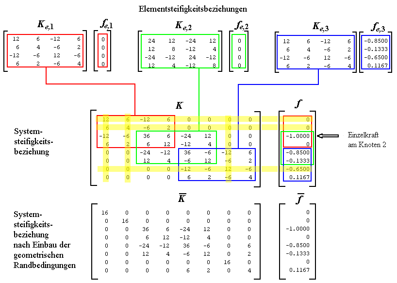 Man sieht, dass die Elementsteifigkeitsbeziehungen direkt auf die entsprechenden Positionen in die Systemsteifigkeitsbeziehung eingespeichert werden. Auf den Positionen, auf die Anteile aus verschiedenen Elementsteifigkeitsbeziehungen gelangen (hier sind es die Bereiche, wo sich die Anteile des Elements 2 mit einem der beiden anderen Elemente überlappen), werden diese addiert. Anschließend wurde im Systembelastungsvektor die äußere Einzellast am Knoten 2 ergänzt.