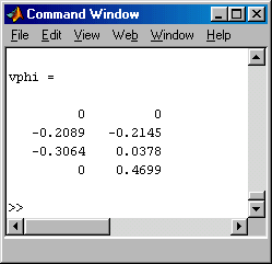 Schließlich liefert das Matlab-Script (Zeile 24) noch die sich aus der Lösung des Gleichungsystems ergebenden Knotenverschiebungen ab (siehe nebenstehenden Ausschnitt aus dem Command Window, in der linken Spalte stehen die Vertikalverschiebungen, in der rechten Spalte die Biegewinkel an den vier Knoten).