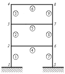 EI = 3,5·106 Nm2 ; EA = 2,9·109 N ; ρA = 100 kg/m ; a = 2 m .Das nebenstehende Bild zeigt die gewählte Knotennummerierung und die Elementnummerierung.