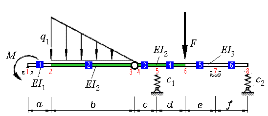 a = 200 mm ; b = 700 mm ; c = 190 mm ;Es sind die Verformungen (Vertikalverschiebung und Biegewinkel) für die markanten Punkte des Systems zu berechnen.