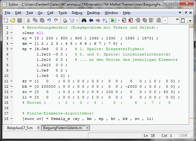 Das oben zu sehende Matlab-Script ist als BiegungFedernGelenk.m zum Download verfügbar. Die für die Berechnung erforderliche Interface-Routine (femalg_m.dll oder femalg_m.mexw64) findet man auf der Seite "Interface-Routinen zum FEM-Baukasten Femset aus Matlab".