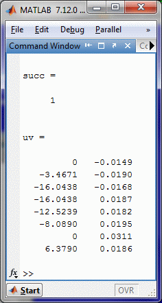 Der Aufruf von femalg_f liefert die Ergebnisse im Command Window ab: Der Ergebnis-Parameter succ gibt mit dem Wert 1 an, dass die Rechnung erfolgreich war. Die Matrix uv enthält in jeder Zeile die beiden Verformungen eines Knotens (Vertikalverschiebung v und Biegewinkel φ). Man beachte, dass die Vertikalverschiebungen für die Koten 3 und 4 (Gelenk) gleich sind, die Biegewinkel jedoch unterschiedlich.