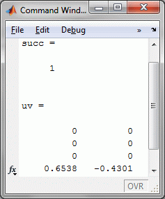 Weil der Aufruf des Mex-Files in Zeile 11 nicht mit einem Semikolon abgeschlossen ist, werden die beiden Rückgabewerte (succ und uv, nebenstehendes Bild) in das Command Window ausgegeben (succ = 1 zeigt den Erfolg der Rechnung an, die ersten 3 Zeilen von uv zeigen die verhinderten Verschiebungen der Knoten 1 bis 3, in der 4. Zeile stehen Horizontal- und Vertikalverschiebung des Knotens 4).