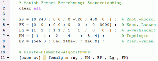 Das nebenstehende Matlab-Script erledigt diese Aufgabe. Die Zeile 11 enthält den Aufruf der Matlab-Femset-Funktion femalg_m, die den kompletten Algorithmus der Verformungsberechnung mit der Finite-Elemente-Methode realisiert.