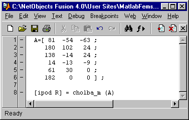 Zu Matlab-Femset gehört zum Beispiel ein Mex-File cholba_m für die Cholesky-Zerlegung einer symmetrischen Bandmatrix. Von den verschiedenen Aufruf-Varianten zeigt der folgende Bildschirm-Schnappschuss die einfachste: