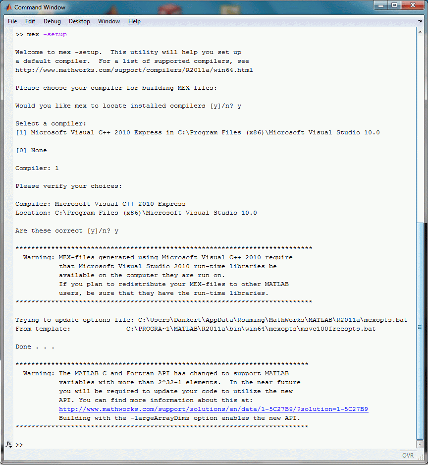 Für das Compileren eines Mex-Files muss dem Befehl mex ein C-Compiler zur Verfügung stehen. Dafür muss (einmalig) ein Setup ausgeführt werden, bei dem der gewünschte C-Compiler zugeordnet wird. Zu älteren (32-Bit-)Matlab-Versionen gehörte ein C-Compiler, der dafür verwendet werden konnte. Es war aber immer eine gute Idee, im Setup dem mex-Befehl den C-Compiler zuzuweisen, der auch für die Compilierung der C-Dateien verwendet wurde, die vom Mex-File aufgerufen werden (und zum Beispiel in statischen Libraries zusammengefasst wurden).
