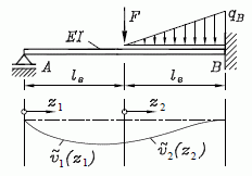 Die nebenstehende Skizze symbolisiert dies: Der für das gesamte System geltende Verschiebungsansatz wird mit bereichsweise geltenden Funktionen formuliert. Zur Bestimmung der Freiwerte in den Ansatzfunktionen sind (abhängig vom aktuellen Problem) verschiedene Wege möglich. Eine besonders elegante Strategie ist möglich, wenn für das Problem ein Minimalprinzip existiert. Für das hier betrachtete Biegeträger-Problem gilt das Minimum vom elastischen Potenzial: