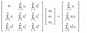 Auf der Seite "Grundlagen der Ausgleichsrechnung wird gezeigt, dass für den hier vorliegenden Fall einer Ausgleichsfunktion 2. Grades die Koeffizienten der Polynomfunktion die Lösungen des folgenden Gleichungssystems sind: