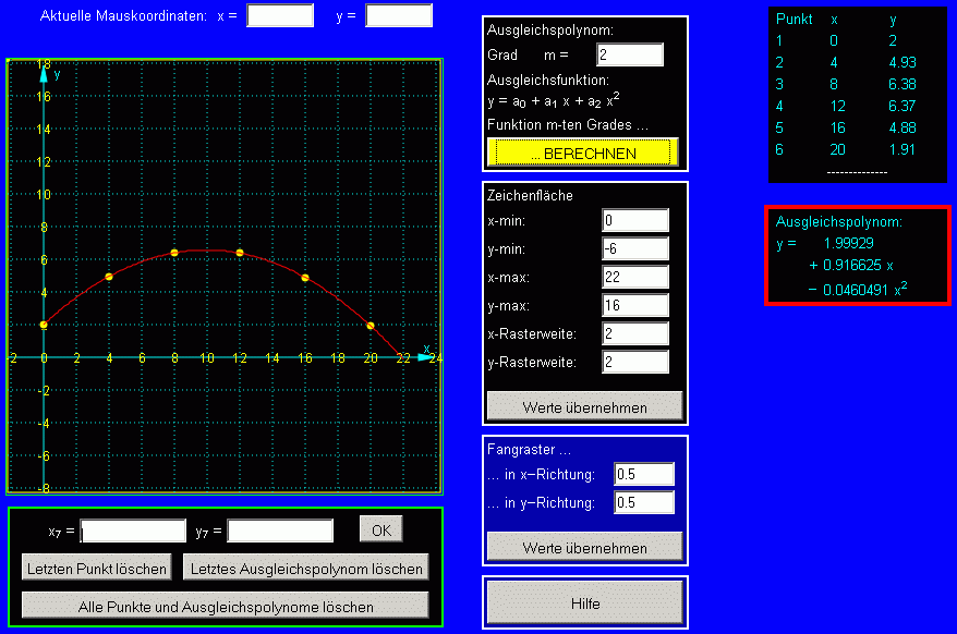 Nach dem Start des Programms sollte man zunächst die Zeichenfläche dem aktuellen Problem anpassen. Danach werden die Punktkoordinaten eingegeben, im vorliegenden Fall sollte man die Eingabe über die Tastatur bevorzugen. Weil die Voreinstellung ein Ausgleichspolynom 2. Grades vorsieht, kann danach der Button "BERECHNEN" angeklickt werden, und der Bildschirm sollte so aussehen: