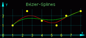 Die Bézier-Splines haben mit den Ausgleichspolynomen die gemeinsame Eigenschaft, nicht alle Stützpunkte zu treffen, allerdings liegen der erste und der letzte Punkt immer auf der Spline-Kurve. Wie bei allen Spline-Kurven ist die Reihenfolge der Stützpunkte (im Gegensatz zur Ausgleichsfunktion) wichtig. Die Bézier-Splines verwenden so genannte "Basispolynome", deren Eigenschaften für die Approximation entscheidend sind. Die nebenstehende Abbildung zeigt die beiden beliebtesten Varianten: Bézier-Bernstein-Approximation (grüne Kurve) und Bézier-B-Spline-Approximation (rote Kurve). Bis auf die Randpunkte, die immer zu den Bézier-Kurven gehören, üben alle übrigen Stützpunkte nur eine "Anziehungskraft" auf den Kurvenverlauf aus.