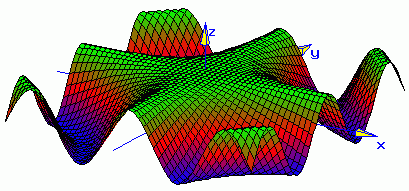 als 3D-Fläche in Parallelprojektion für den Bereich −2 ≤ x ≤ 2 und −2 ≤ y ≤ 2.
