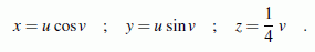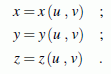 Deutlich flexibler ist die Parameterdarstellung, bei der die drei Koordinaten x, y und z in Abhängigkeit von zwei Parametern u und v beschrieben werden: